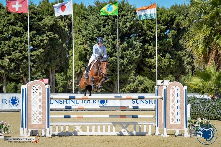 The 4th week of the Autumn Tour started up with the Young Horse classes today. here at Montenmedio. The 7yr old class was won by Kara Chad riding Irinka Lady who is by Etoulon and out of an Eldorado Van de Zeshoek mare, owned by Matt Sampson who was also third in this class. Kara won the class in a very fast time of 35.56sec, over a second faster than Laura Kraut with the lovely Seleste B Z who is owned by VOF HX Horses and is by Spartacus TN from a mare by Chardonnay Z. In third place was Matthew Sampson with the very consistent Jafabalou by Balou du Rouet, dam sire Concorde Keur, owned by Rachael Evison. This pair are no strangers to the podium here at the Tour.