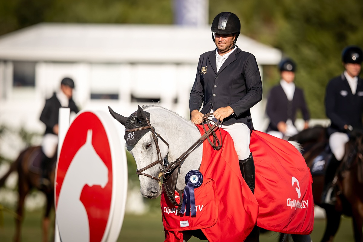 Local Spanish rider Carlos Bosch Cebrián and his 9yr yr old mare, ’Jolie van der Berghoeve KAR', (‘Jaguar VD Berghoeve’ x ‘Kannan’), owned by KAR Sport Horses LLC, are the winners of the Clip My Horse TV Trophy, the first FEI Longines Ranking class, here at the fifth Andalucía October Tour. This was a 1.45 speed class, held in the iconic David Broome a 1.45 and had a couple of serious roll backs and some interesting combinations and related distances that really challenged the 95 competitors. 65.64s was the very fast winning time and one second faster than the Swiss rider, Bryan Balsiger with ‘Castiel’ who took second place.