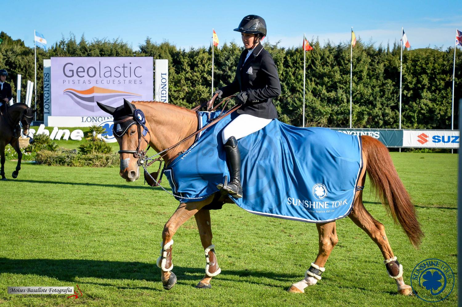 After receiving the Trophy from the Director of Geolastic, Guillermo González Eguinoa, Gudrun told us “It seems like my mare really likes this arena!”  It’s not the first time that this pair have won similar classes in this arena, just last year they were the winners of both the Grand Prix class sponsored by Horseware and also the GP sponsored by the Diputación de Cádiz. “My mare jumped really well both in the first round and the jump off.  I’m very happy with her.  The track was big enough but comfortable for the horses and rode well.” Gudrun told us she plans to “compete in the Horseware GP on Sunday with Monalisa, who needs to continue to build up her experience and in the Equine America GP, in the second week of the Tour, I will ride Kashmira”.