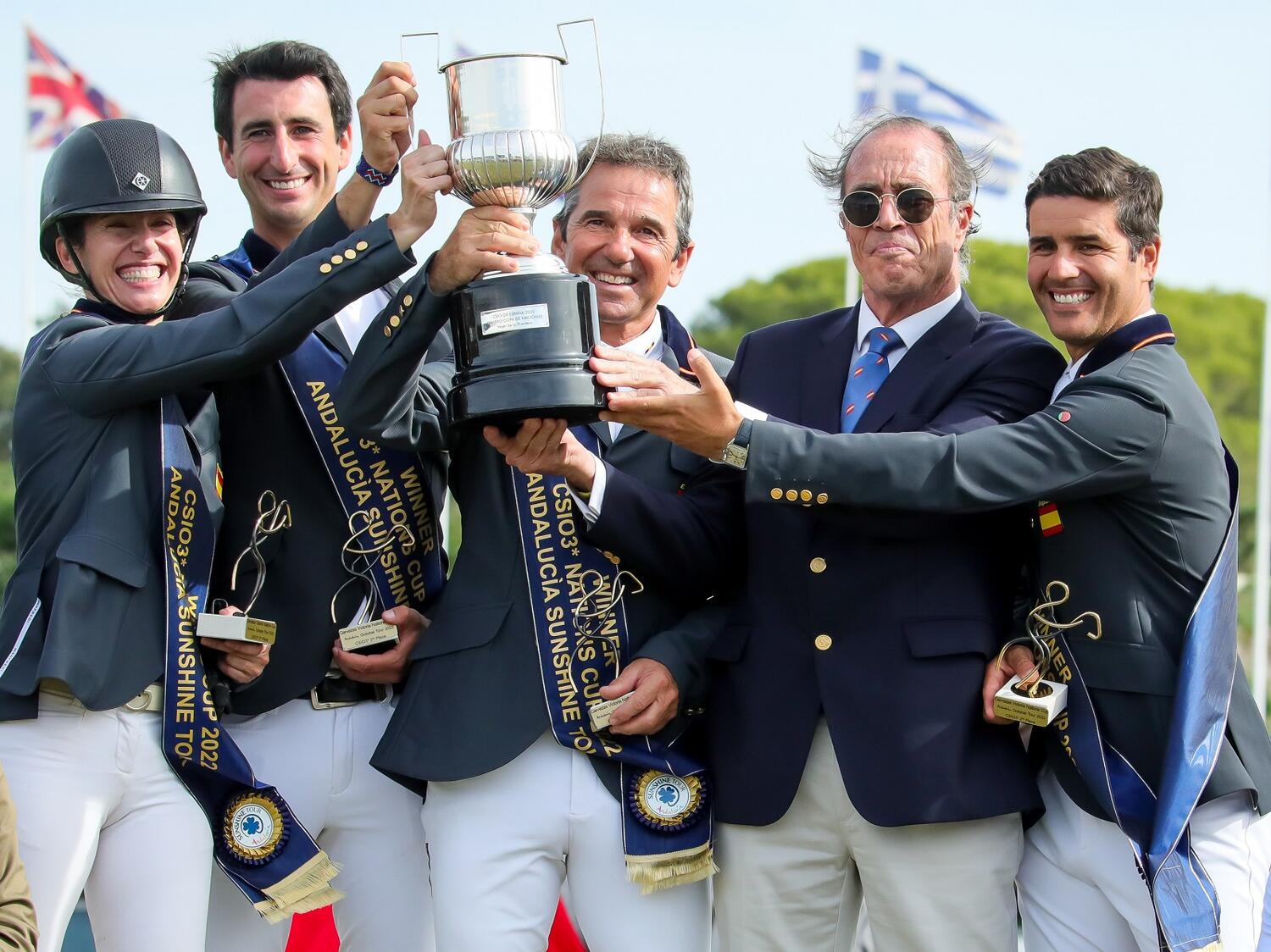 Today it was Gold for Spain in the Nations Cup. The whole event was sponsored by Cervezas Victoria who are regular sponsors of the II Andalucía October Tour. The Spanish chef d’equipe was Carolo López Quesada and he was delighted with the performance of his team. With three riders jumping clear in the first round, the team were in the lead going in to the second part of the competition. Jesús Garmendía Echevarría was riding the brilliant ‘Callias’; Santiago Núñez Riva with the lovely mare by ‘Crown Z’ ‘Chakira Z’ and Ismael García Roque with the chestnut ‘Gaudí’. These three all ‘popped’ around the demanding course in great style. Jesus repeated his immaculate clear in the second round keeping Spain in the lead, Teresa Blázquez Abascal, finished her second round in great style jumping a very smart round with ‘Nasa de Toxandría’,with just one unlucky pole and kept Spain well in the lead. Santiago was the third rider to go and he flew around clear and that was it, Spain had won and Ismael had no need to jump!