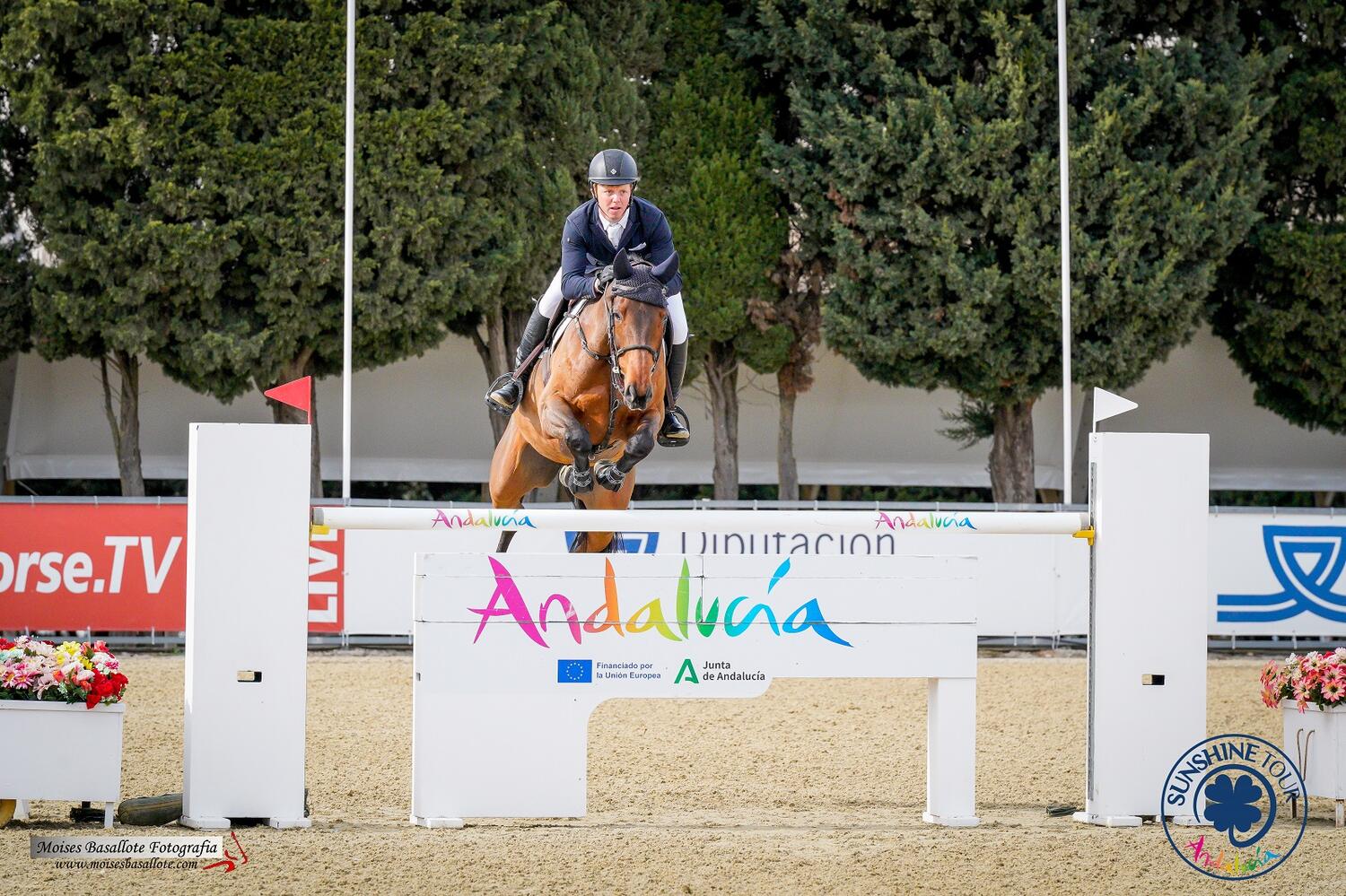 There’s no stopping this talented young British rider, Matthew Sampson, starting off his week winning today’s big class, just as he did in the first week on the 19th, with the super athletic bay mare ‘Elisa BJX’. It is the second week of the Andalucía Pre Sunshine Tour, which is kindly sponsored by the Consejería de Turismo, Cultura y Deporte and co-financed by European Union, and this very fast 11 yr old, bay mare, ‘Elisa BJX’ once again showed her class today. The mare is by ‘Eldorado VD Zeshoek’ with the dam sire ‘Quilot’ and today she literally flew around the Milton arena, over the 1.40 course, to complete in 61.33 seconds and no one else came anywhere close to her time. A very happy Matt, who was also 6th with ‘MGH Candy Girl’, told us after the class, “‘Elisa BJX’, well, she’s great and really consistent and the plan is to build her up to bigger classes throughout the tour!’